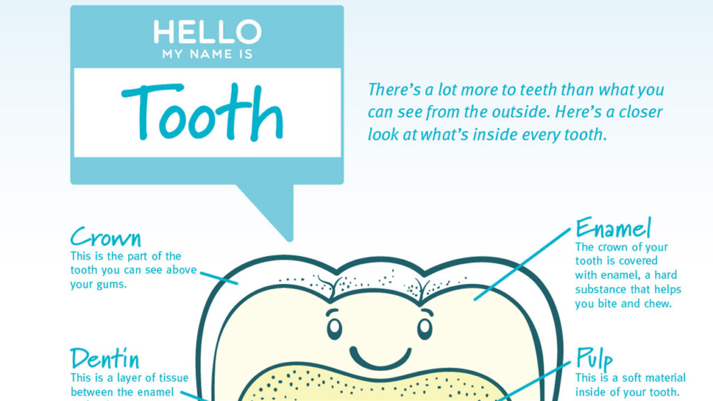 My friend, Tooth, provides a closer look at what’s inside every tooth. This dental worksheet details the function of each part of the tooth. Each tooth consists of a crown, enamel, dentin, pulp, nerves and blood vessels, roots and cementum.